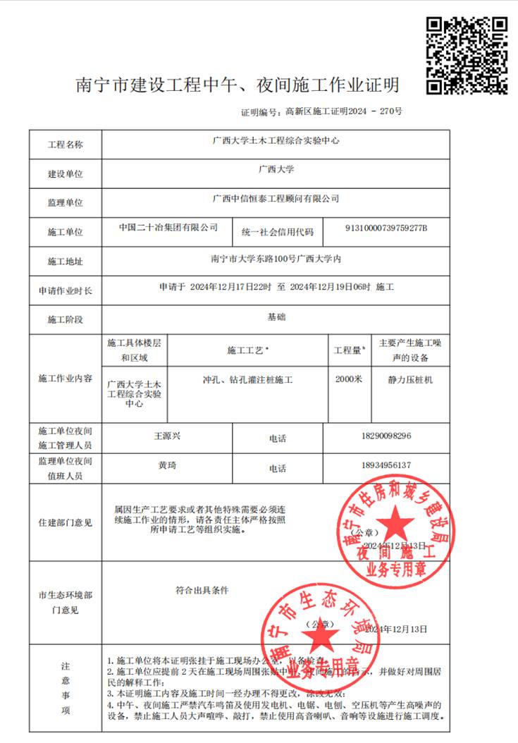 我单位承建的best365足球官网土木工程综合实验中心项目因施工工艺需要,在符合法律许可的夜间施工条件之下,经南宁市住房和城乡建设局、南宁市生态环境局核准,计划于2024年12月17日22:00—2024年12月19日6:00进行静压桩施工(详见附件)。我方将按照建设局、环保局要求,采取措施尽可能减少影响。施工期间可能会对广大师生员工的日常生活造成一定的干扰。对此,我们深表歉意,敬请谅解!