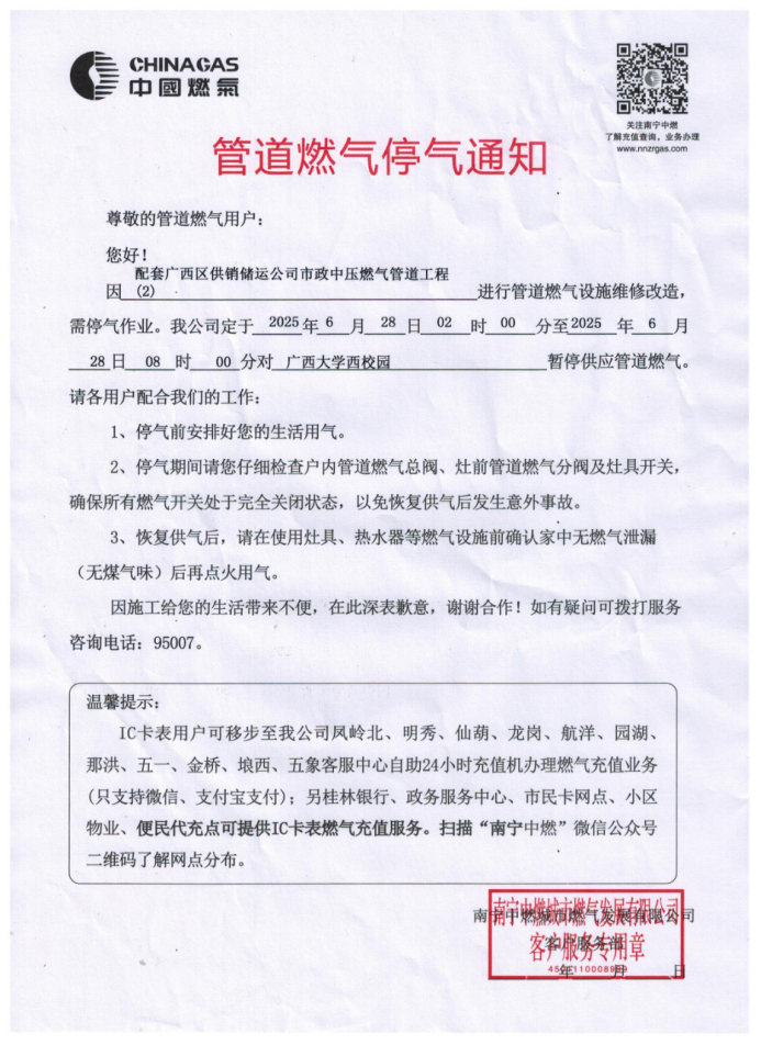 接到南宁中燃城市燃气发展有限公司通知,因配套广西区供销储运公司市政中压燃气管道工程进行管道燃气设施维修改造,需停气作业。